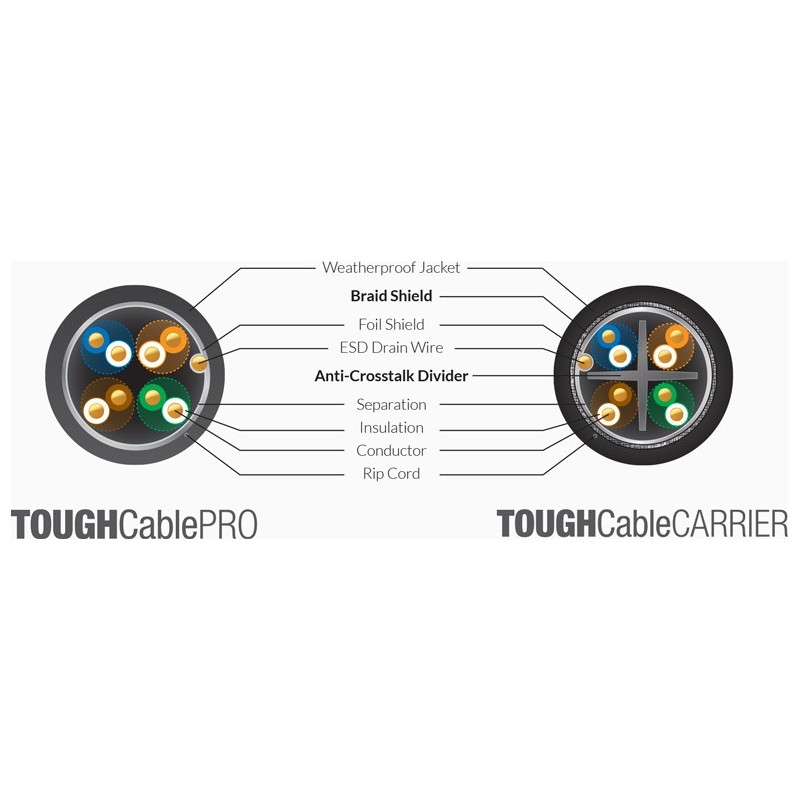 The UISP-Cable-Carrier is a Category 5e cable that delivers multilayered elemental protection with a primary braid shield and a weatherproof jacket that prevents damage from rain, snow, and other harsh climatic conditions.