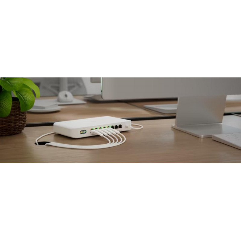 The switch provides 35W of PoE+ power when used with the included 60W adapter. When paired with the optional 210W adapter, total PoE availability increases to 185W. The polycarbonate enclosure, low power draw and integrated status display make the device suitable for both small business setups and larger network environments.