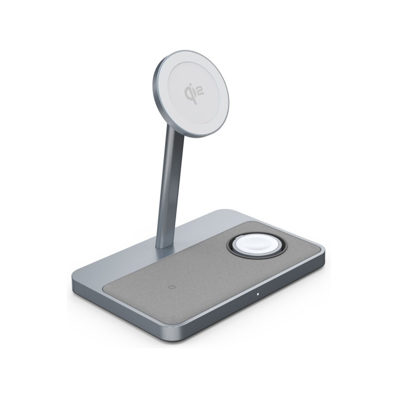 Med Andersson Qi2/Magnetic Wireless Charger Stand 3in1 30 W kan du ladda din mobiltelefon, trådlösa hörlurar och Apple Watch samtidigt.